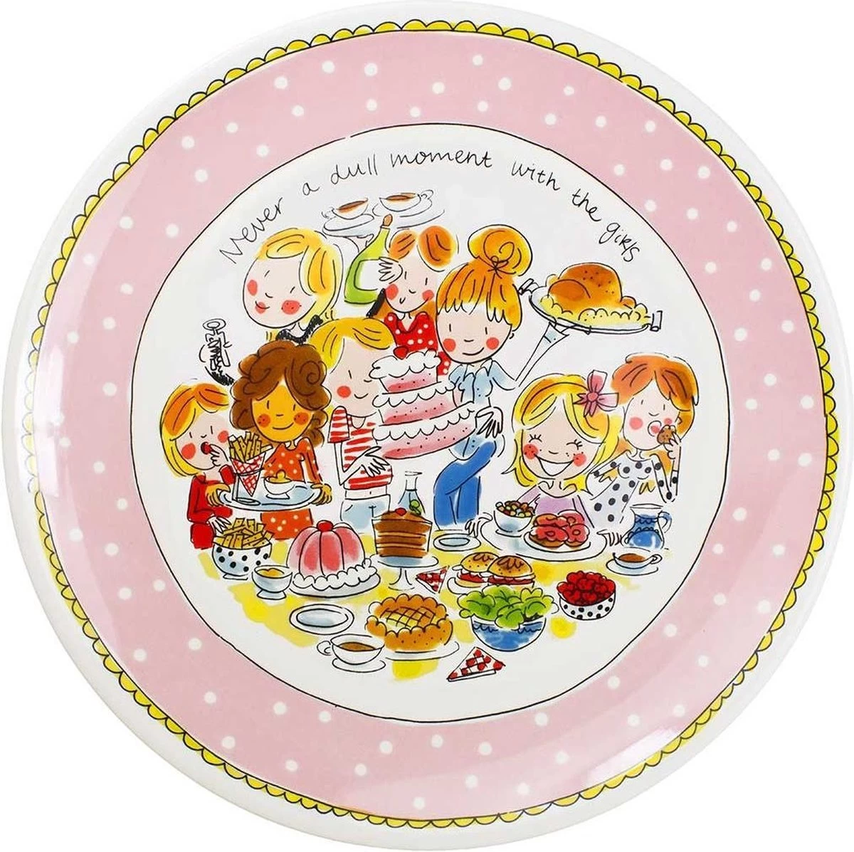 Serveer lekkernijen in stijl met dit grote platte bord van Blond Amsterdam. Het bord heeft een diameter van 33 cm en een roze, gestipte rand. Het is onderdeel van de Even Bijkletsen serie dus beschikt ook over een vrolijk tafereel van een groep vriendinnen. Ontdek de rest van het vrolijke Blond Amsterdam servies en alle andere borden in onze webshop.