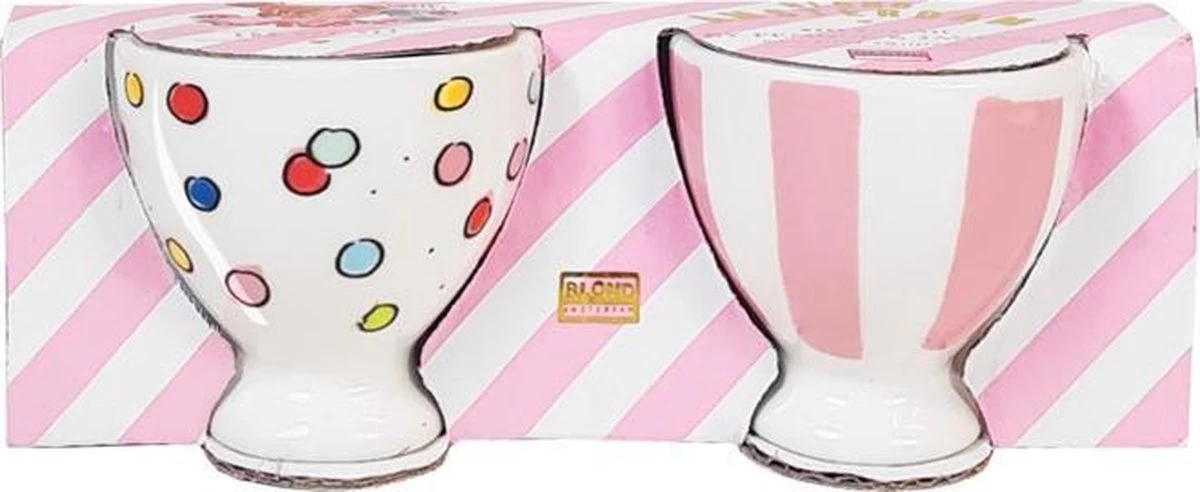 Maak je ontbijttafel compleet met deze leuke set van 2 eierdoppen. De ene eierdop heeft een sterrenprint en de andere eierdop heeft roze strepen. Je kunt deze eierdoppen goed combineren met de andere sterren en strepen items van de Even Bijkletsen collectie.