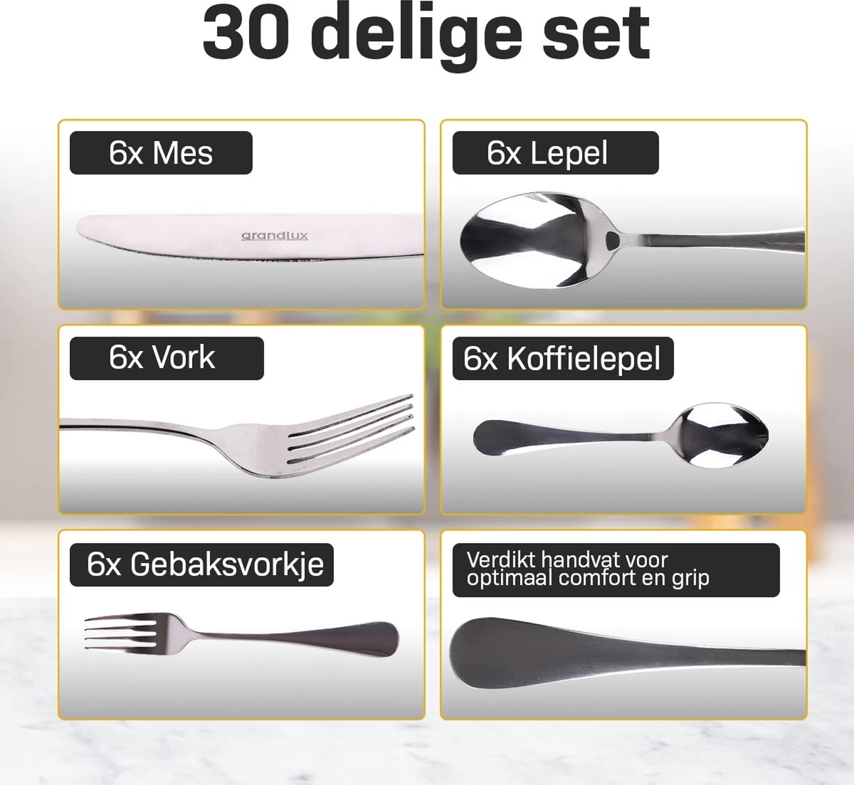 De Grandlux bestekset bestaat uit 30 stuks en is hierdoor geschikt voor 6 personen. Je hoeft je daarom niet druk te maken dat je niet genoeg bestek hebt voor je gasten, of als er nog bestek in de vaatwasser zit. Onze set is bestaat uit: