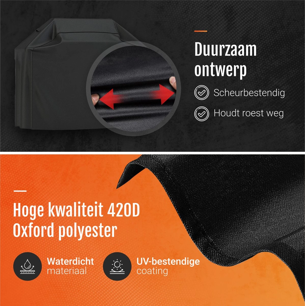 Echte barbecue-fanaten verdienen hoge kwaliteit hoezen. De barbecuehoes van GrillX is dan ook gemaakt van 420D Oxford polyester. De hoes opgebouwd uit verschillende lagen: een waterdichte laag, een uv-bestendige laag en de sterke polyester laag.