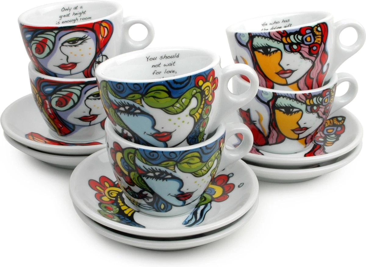 Breng kunst op je tafel met de kopjes en schoteltjes van kunstenares Josien Broeren. De unieke en kleurrijke ontwerpen vrolijken je tafel op in no time! De kopjes zitten verpakt in een leuke set van 6.