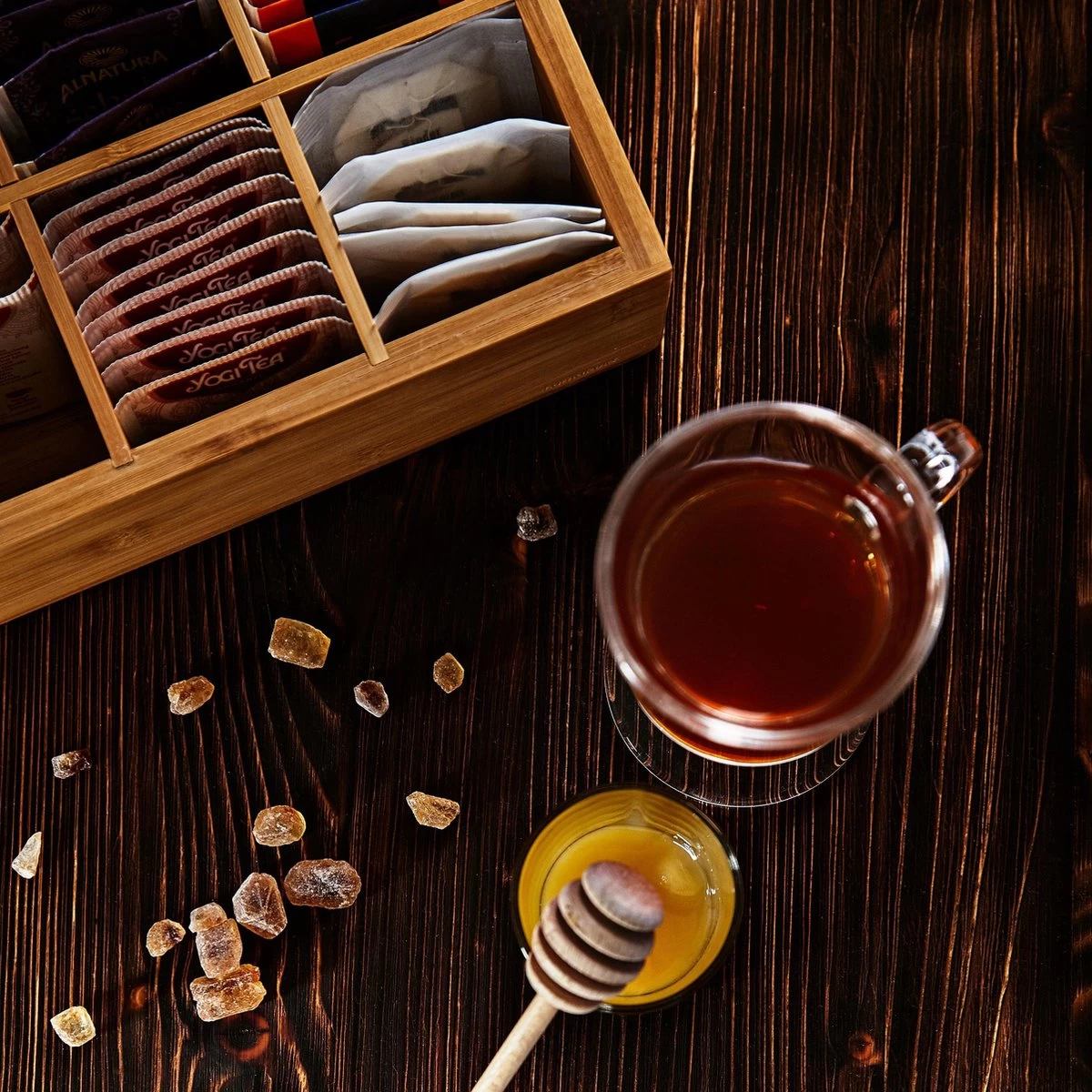 De stijlvolle en decoratieve bamboe theedoos uit de Lumaland Cuisine is uitgerust met 8 vakken en geschikt voor alle gangbare theezakjes. Door het transparante venster is direct zichtbaar hoe vol de theebox is en of deze eventueel bijgevuld moet worden.