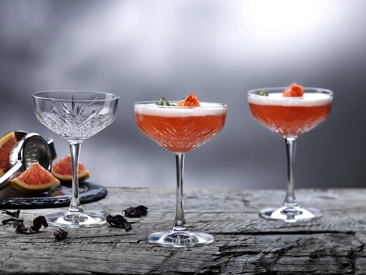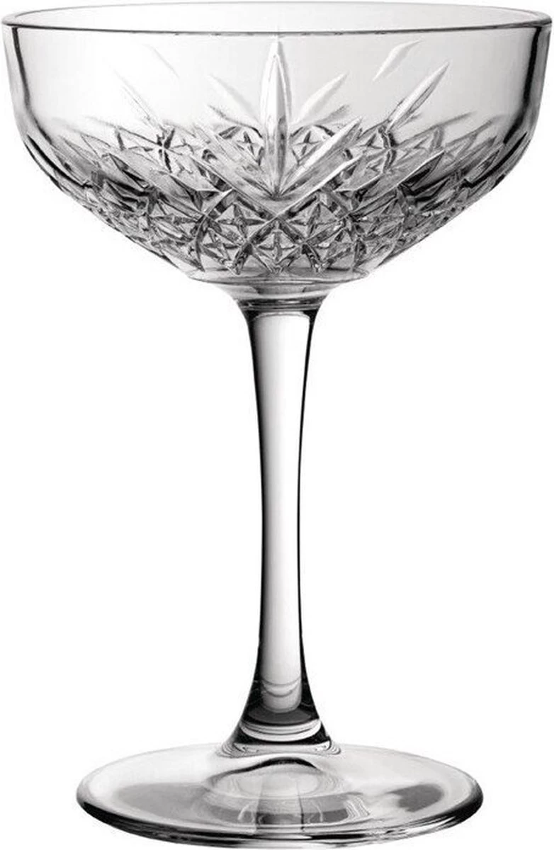 Deze champagne coupes zien er totaal anders uit dan traditionele champagneglazen. Dankzij het verrasende design hebben een elegante en stijvolle uitstraling. Het glas is aan de onderzijde van de bolling bewerkt met een fraai patroon. De glazen hebben een inhoud van 270 milliliter en worden geleverd als set van twaalf.
