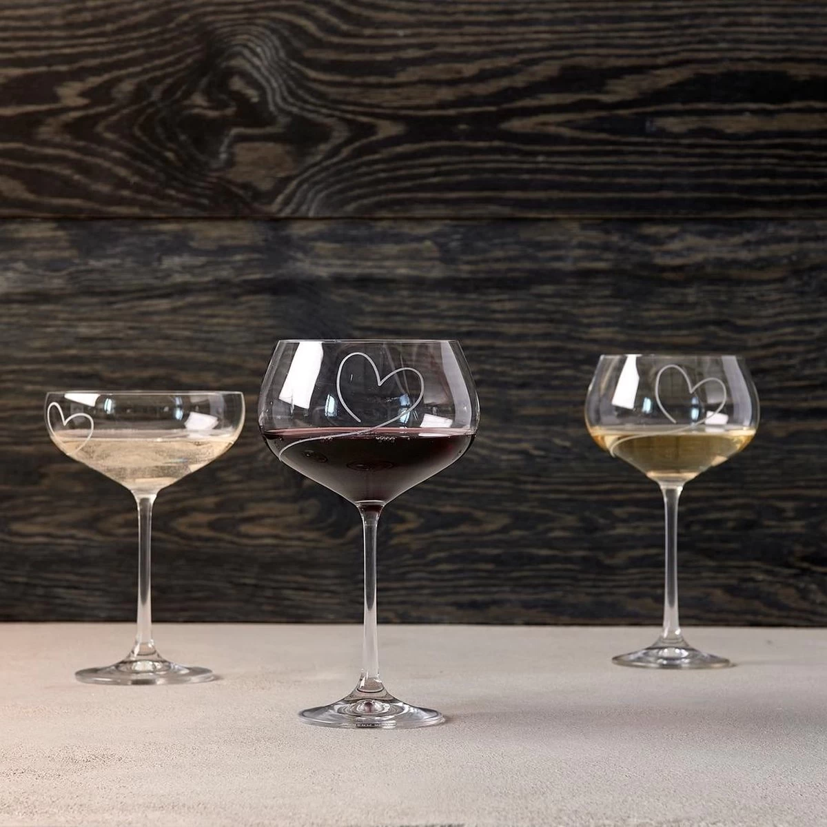 De coupe is een klassieke glasvorm, vaak gebruikt voor champagne en weer helemaal terug van misschien wel nooit weggeweest. Op het mondgeblazen glas van het With Love-champagneglas is met de hand een speels hart aangebracht, met liefde gemaakt dus.