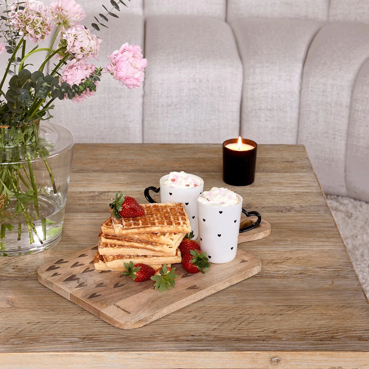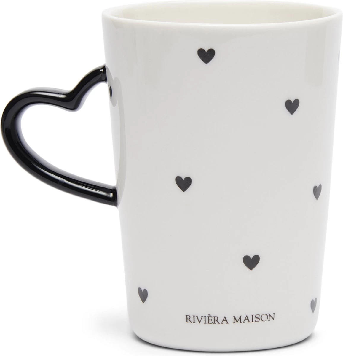 De RM Love Mug L is een grote thee- of koffiemok, maar natuurlijk ook ideaal voor andere warme dranken. De lichte mok van porselein heeft een vrolijk patroon van zwarte hartjes en een zwart oor in de vorm van een hart. De RM Love Mug is verkrijgbaar in meerdere formaten.