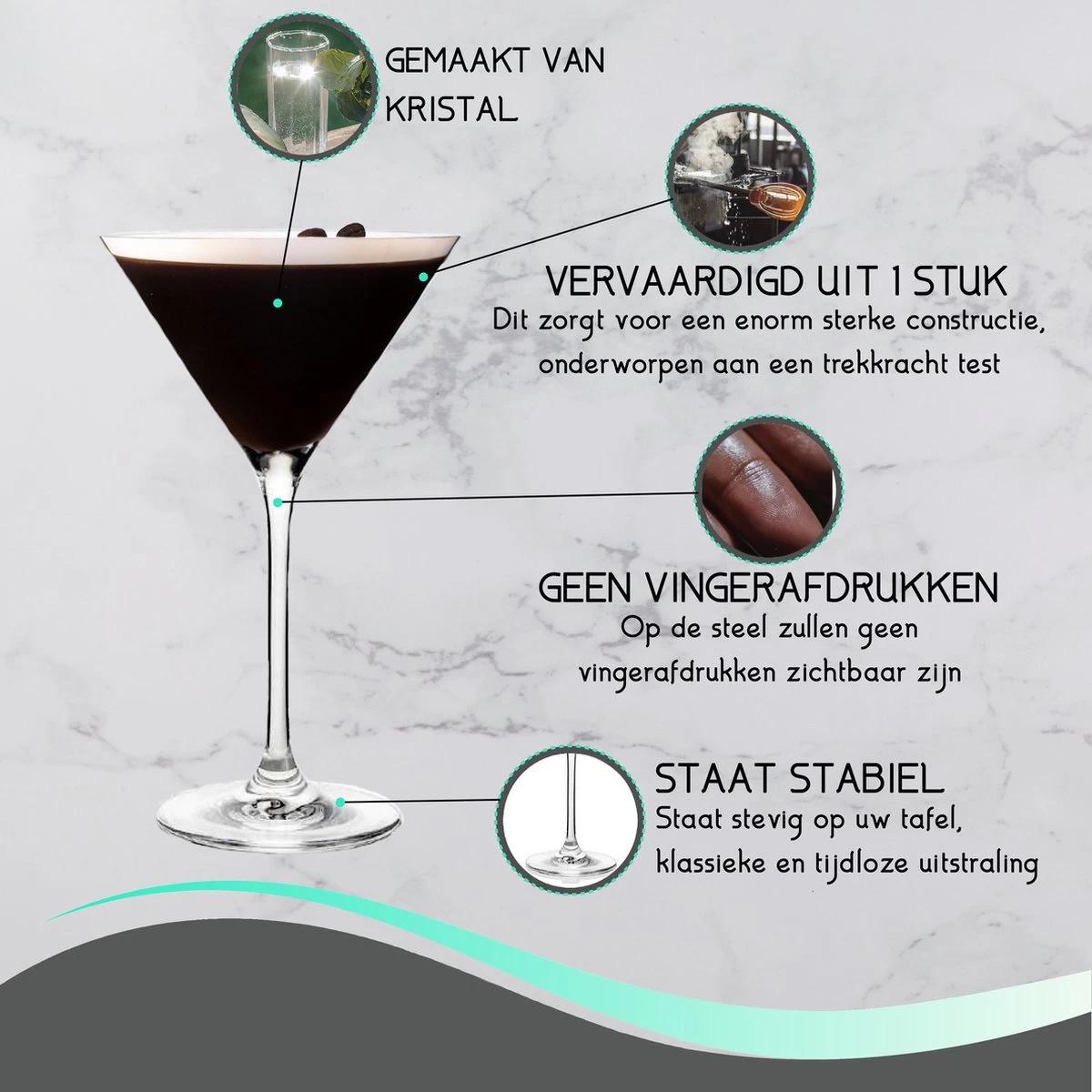 +Elegante & gestrekte steel, de glazen zijn uit één stuk vervaardigd dit zorgt voor een enorm sterke constructie. De steel is vrij van vingerafdrukken, en onderworpen aan een trekkracht test.