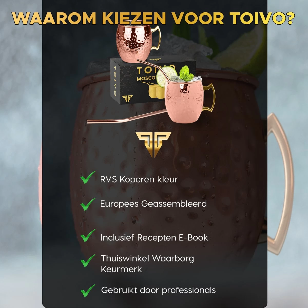 De set bevat twee Toivo Moscow Mule bekers, Twee koperen rietjes, een Toivo Handleiding en een GRATIS E-Book met daarin een heleboel recepten en tips voor dè perfecte cocktail!
