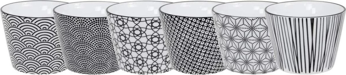 Prachtige set van 6 kopjes uit de Nippon Black collectie van Tokyo Design Studio. Deze set is van hoogwaardig porselein en elk kopje heeft een inhoud van 180 milliliter. Elk kopje heeft een andere sierlijke print, wat zorgt voor een speels effect.