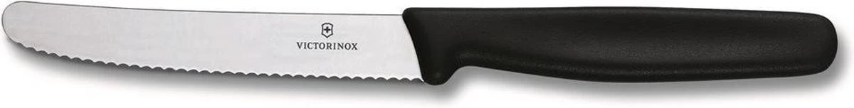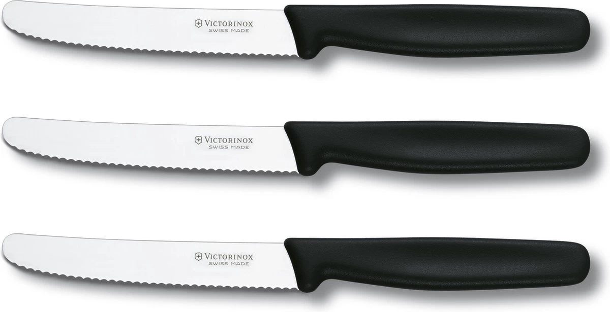 Set van 3 vlijmscherpe tafelmessen van Victorinox, fabrikant van het beroemde “Original Swiss Army Knife”. De gekartelde lemmeten zijn vervaardigd van het hooggelegeerd roestvrij staal met een optimale staalhardheid. De heften van zwarte Polypropyleen kunststof liggen daarnaast uitstekend in de hand. Gemaakt met Zwitserse precisie, zo scherp als een scheermes.
