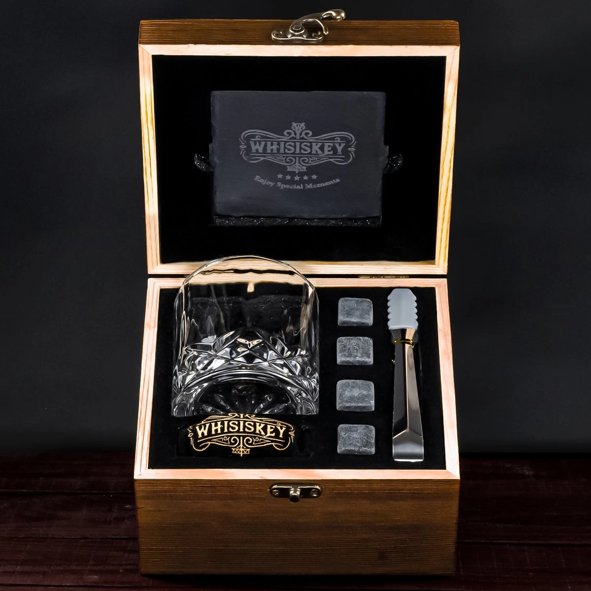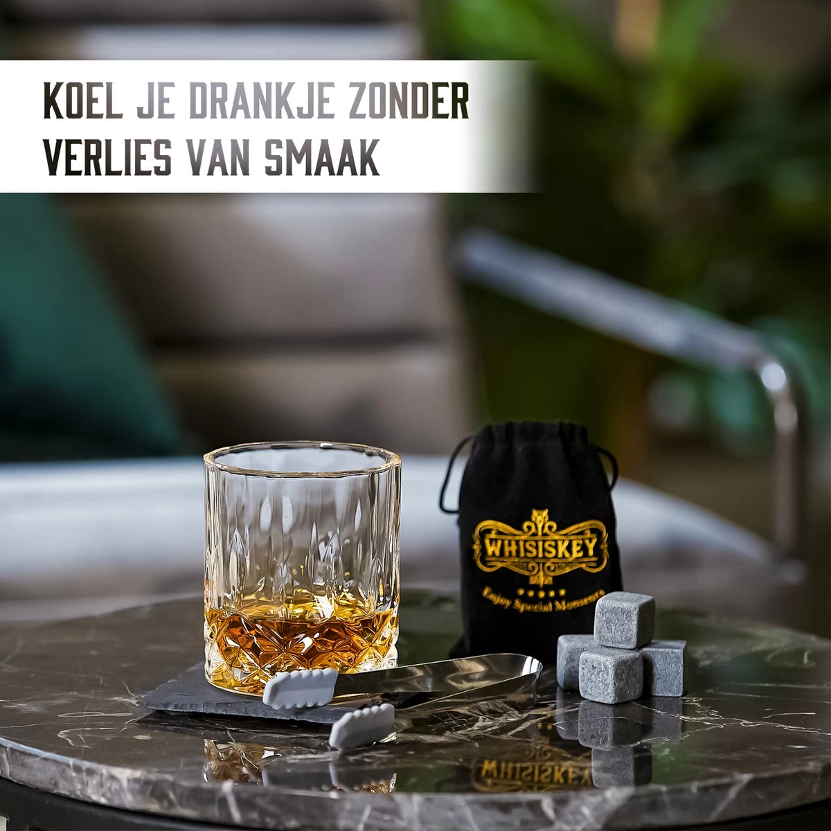 Trakteer jezelf of een andere op deze whiskey geschenkset. Een complete set om nog meer uit jouw whiskey moment te halen. De set bevat één zwaar tumbler whiskey glas, 4 granieten whiskey stenen, een opbergzakje om de stenen netjes bij elkaar te houden en ijstang en een lijsstenen onderzetters. Dit allemaal netjes verpakt in een luxe houten giftbox.