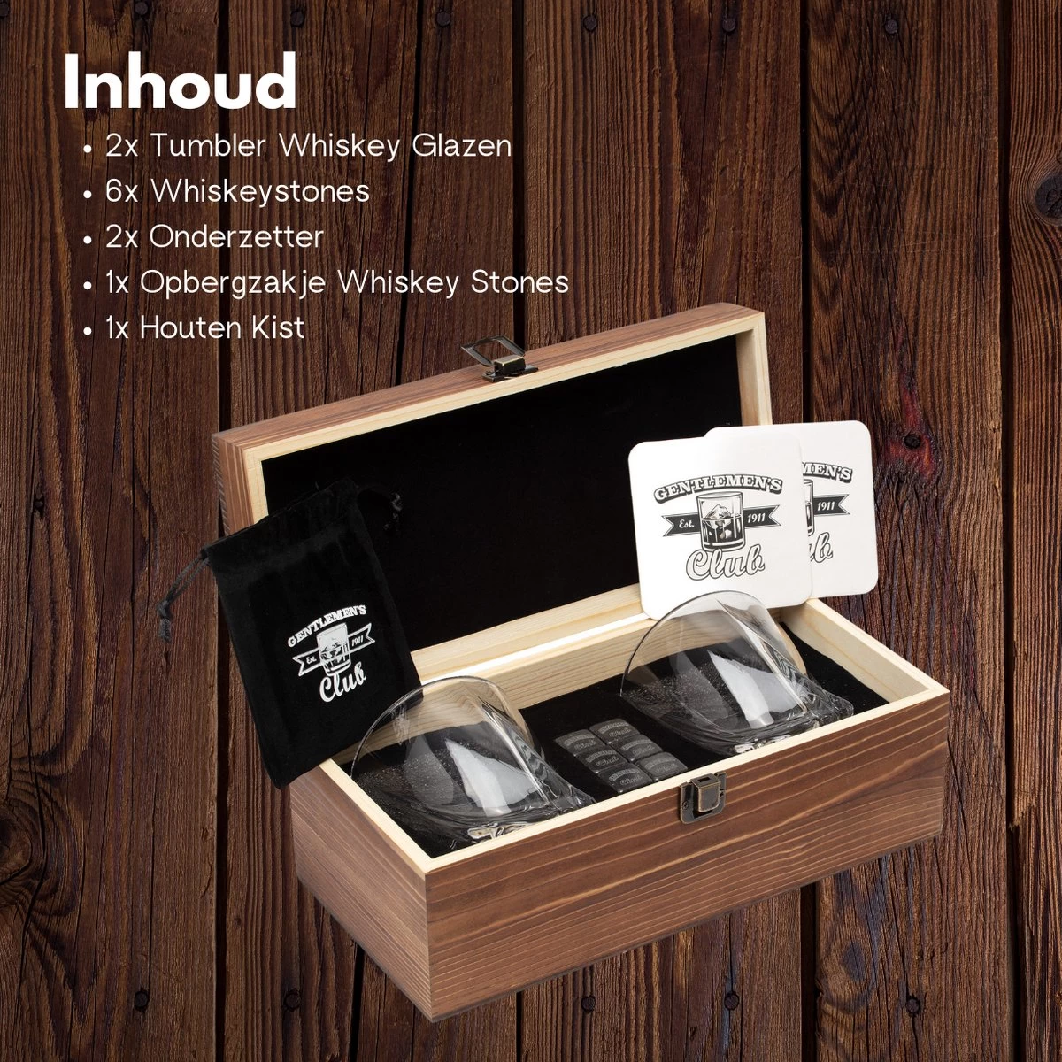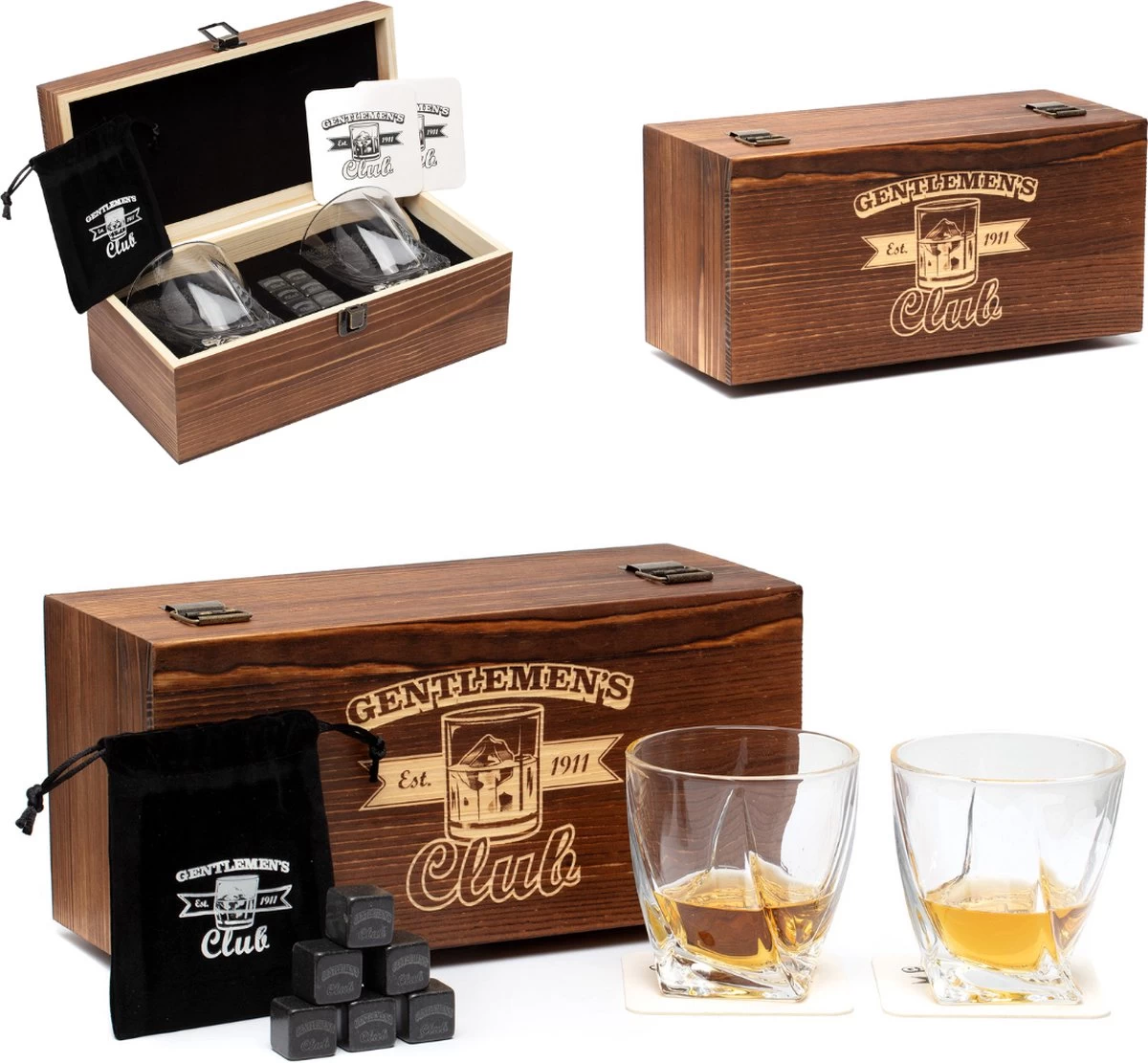 Whiskey gift set van The Gentlemen’s club 1911, Het perfecte cadeau om te geven, maar nog veel leuker om te krijgen. Complete set, met Onderzetters, Whiskey Stenen & Bewaarkist.