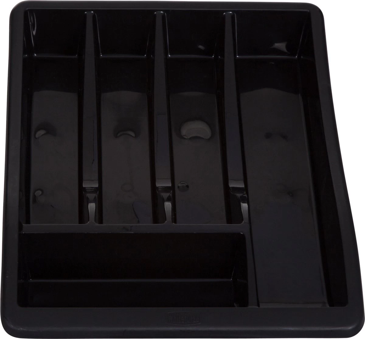 Bestekbak/keuken organizer zwart. Deze besteklade beschikt over 5 aparte compartimenten voor het scheiden van lepels, messen, vorken en ander keukengerei. Afmeting: ca. 30 x 38 x 6 cm. Materiaal: kunststof.